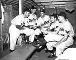 Manager L. D. Meyer, whose Dallas lost opener to Cats and Texas League lead, talks strategy with key players. Left to right are Meyer; Righthander Ray Narleski (5-0), who pitches; Walt Lanfranconi, seven game winner whom Cats defeated last two times out, and Outfielders Ben Guintini and Jim Fridley. Published in Fort Worth Star-Telegram evening edition, May 29, 1951. Five men sitting and standing around looking at each other smiling wearing a baseball uniforms and caps.