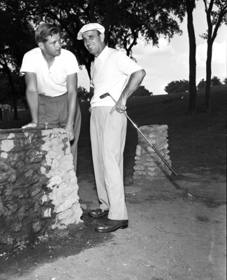 Image shows Fred Hawkins, left, El Paso and Toney Penna, Cincinnati, Ohio posed by wall on golf course at Colonial National Invitation Golf Tournament. They are taking a water break during practice. Published in the Fort Worth Star-Telegram evening edition May 27, 1951.