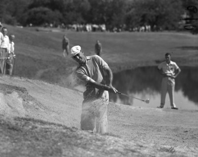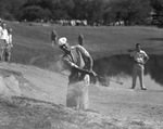 Golfer Ben Hogan blasts from sand trap at 16th green, Colonial National Invitation golf tournament, 05/23/1951