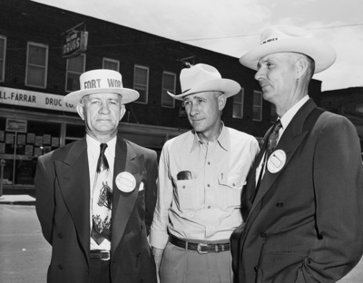 Fort Worth business leaders making a fourth-day swing through East Texas found cordial receptions during frequent stops. Image of Bailey Powledge, left, of Armour & Company, and Walter Rice, right, representing the Fort Worth Stockyards, conferring with Hopkins County Agent Brooks Emmons at Sulphur Springs. Published in Fort Worth Star-Telegram morning edition May 24, 1951.