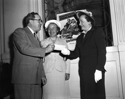 A check for $258 was presented to the chairman of Fort Worth's Cancer Crusade, Lyle Sproles, left, by members of the Alpha Beta chapter of Delta Rho Delta, Mrs. Alma Jo Barnett, center, assistant chairman of the organization, and Mrs. Ouita White, right, social service chairman. This contribution was given to go towards the Cancer Crusade target goal of $38,500. Published in the evening edition, May 24, 1951.