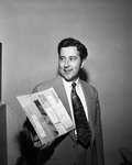 Image shows Vernon Forrester, holding an envelope, covered in postage. He is wearing a light colored suit, and looking off toward the left of the image. Published in the morning edition, May 24, 1951.