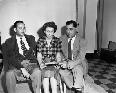 New officers of the Panther City Philatelic Society, are shown discussing plans for the next year. Left to right, are James A. Quigley, president, Mrs. Mildred Brock, secretary-treasurer, and Charles W. Brock, vice president. Published in the morning edition, May 27, 1951.