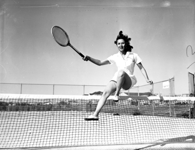 Vida Mitchell, pretty Texas Christian University (TCU) senior from Austin, takes tennis and the sun in stride.