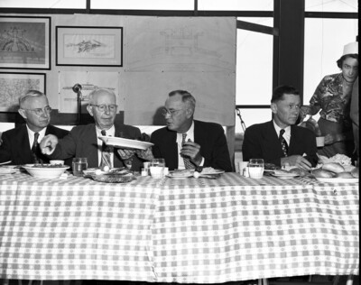 Greater Fort Worth International Airport. Series not published on Texas Highway Commission luncheon in the Amon Carter terminal building. A group of men is seen eating together.