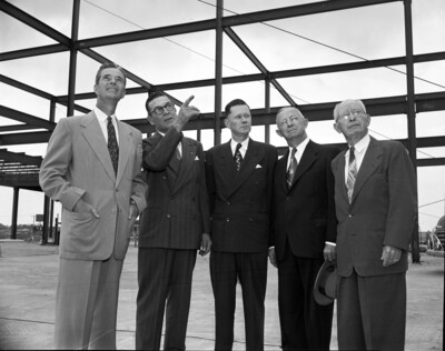 Greater Fort Worth International Airport. Series not published on Texas Highway Commission luncheon in the Amon Carter terminal building. A group of men are seen standing at the construction site.