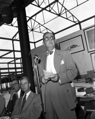 A man in a suit speaks into a microphone at the Texas Highway Commission luncheon in the Amon Carter Terminal Building.