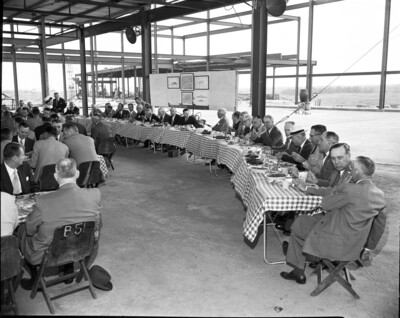 A group of people seated at a table during the Texas Highway Commission luncheon in the Amon Carter Terminal Building.