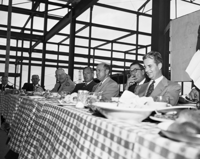 Barbecue was served on the passenger level of the Amon Carter Terminal Building, when 300 people gathered at Greater Fort Worth International Airport to honor the Texas Highway Commission. Left to right are Major General, C. S. Irvine, commander of the 19th Air Division at Carswell Air Base; Eugene McElvaney, senior vice president of Dallas' First National Bank; L. C. Elliott, regional administrator for the CAA; W. O. Jones, City Manager; and E. H. Thornton, highway commission chairman. Published in the evening edition, May 26, 1951.