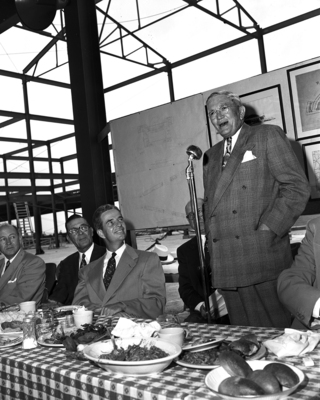 Approximately 300 people attended a noon luncheon on the passenger level of the Amon Carter Field and Terminal Building at the Greater Fort Worth International Airport. The luncheon was held in honor of the State Highway Commission. This image shows R. L. Thornton, chairman of the board of Mercantile National Bank in Dallas, and president of the State Fair Association. Published in the evening edition, May 26, 1951.