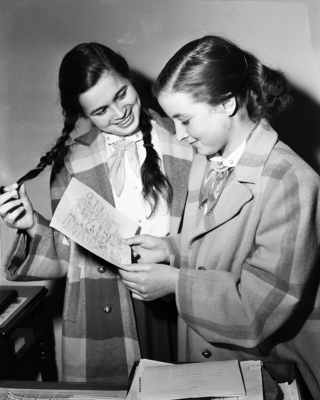 Christa Willmans, left, and Brigette Spiegelhauer, right, essay contest winners from Germany, are shown looking over a Technical High School map in which Texas dominates the United States. The young women are touring thirty states as the award for winning in the Freedoms Foundation contest in which 109,000 essays were entered. Published in the evening edition, May 25, 1951
