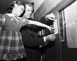 Charles Berry, principal of Meadowbrook Elementary and Junior High School, is shown posting a list of pointers relating to polio on the school bulletin board as Judy Oxford, a Meadowbrook first grader, looks on. Published in the evening edition, May 28, 1951.