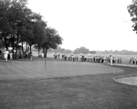 Image shows Earl Stewart Jr standing right, center, in front of crowd makes a 75 feet chip shot for an eagle on first hole at Colonial National Invitation. The ball came to rest between the pin and rim of the cup, Stewart scoring 72. Unidentified golf caddie is shown walking on course on left. Published in the Fort Worth Star-Telegram morning edition May 26, 1951.