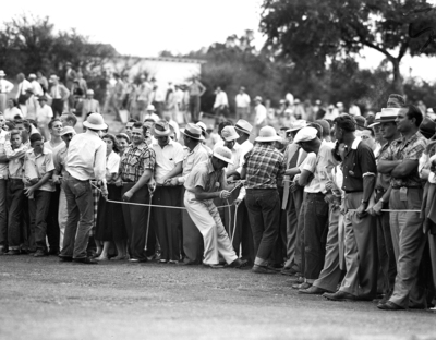 Image shows Marshals hold rope against crowd at 18th hole in the Colonial Tournament. Thousands of guests in crowd were trying to watch finals. Published in the Fort Worth Star-Telegram morning edition May 26, 1951.