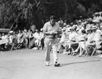 Image shows Ed (Porky) Oliver, holding golf club and ball, walking on green at 18th hole at Colonial National Invitation Golf Tournament. He shot a low round, a three under 67. Published in the Fort Worth Star-Telegram morning edition May 26, 1951.
