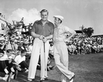 Image shows Joe Kirkwood Jr, heavyweight champion, left and Bob Toski on 18th hole after scoring a 69. They are posed holding a golf club in front of a crowd at Colonial National Invitation. Published in the Fort Worth Star-Telegram evening edition May 26, 1951.