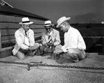 Image taken of the first wheat crop of the 1951 harvest that reached Fort Worth from Knox County. Shown inspecting the No. 1 dark, hard grain, are, left to right, W. R. Walton, of the Rock Island Grain Company; Louis Hecker, of Transit Grain Company; and I. L. Bruce of Munday, the trucker who brought the grain into Fort Worth. The wheat was purchased by Transit and sold to Rock Island Grain Company. Published in the evening edition, May 26, 1951.
