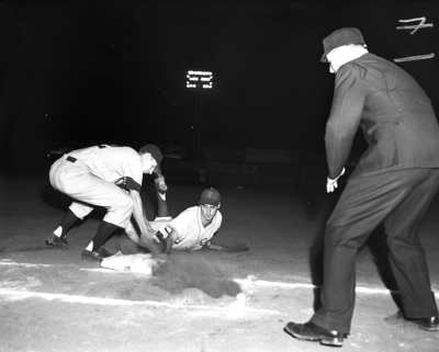 The Cats' Joe Torpey reaches for first base as First Baseman Donald Eggert of Tulsa tries to tag him in the first inning of first game at La Grave Field. Eggert had taken a throw from the pitcher. A man sliding on the field on his stomach legs bent up, hand is not shown it's in the sand and arms are shown on the ground. A man bending down in white baseball uniform torching ground. A man in a black suit is a few inches from them watching with a black cap on his head. Published in Fort Worth Star-Telegram morning edition, May 27, 1951.