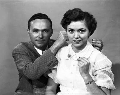 Clyde McClure, left, is shown adjusting a pearl necklace that was won by his sister, Norma Jean, who was named Best All Around Girl at Texas Wesleyan College (TWC). Norma Jean also received the W. F. Hamilton scholarship award, which Clyde had previously won when he graduated the year prior. Their parents were Mr. and Mrs. C. R. McClure, of 3016 Bright. Published in the morning edition, May 29, 1951.