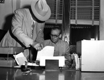 Bert Wakefield, seated on the right, was indicted in March, 1951, on two felony gambling complaints, posted a $5,000 bond. On the left, Sheriff Sully Montgomery, who had arrested Wakefield in Las Vegas Navada earlier in the week, is shown examining the signature. Published in the evening edition, May 29, 1951.