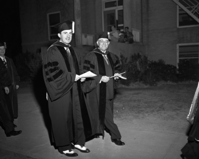 Governor Shivers, left, marched beside Texas Christian University (TCU) president, Sadler, in the processional which led 458 candidates for degrees to the West Quadrangle at TCU. Published in the morning edition, May 29, 1951.