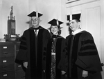 Honorary doctorate degrees were conferred by Texas Wesleyan College at its commencement exercises. The degrees were awarded to, left to right, Dr. Henry Elbert Stout, Electra Waggoner Biggs, and David B. Foltz. Dr. Stout received a doctorate of humanities, Mrs. Biggs a doctorate of fine arts in creative arts, and Foltz a doctorate in music. Published in the evening edition, May 28, 1951.