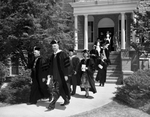 Honorary degrees in three fields were conferred at Texas Wesleyan College's (TWC) commencement exercises. Pictured left to right, are Dr. Walter R. Glick, TWC vice president, Dr. Elbert Stout, former TWC president who received an honorary doctorate in humanities; Dean Elmer J. Cox, Electra Waggoner Biggs, of Vernon, who received the honorary degree of doctor of fine arts, and David Baron Foltz, who received an honorary a doctorate in music. Published in the evening edition, May 29, 1951.