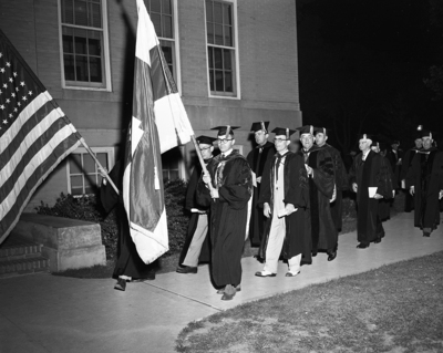 A processional of faculty members and executives marched with Governor Allan Shivers at the head at a Texas Christian University (TCU) commencement exercises on the campus. Left to right, are Dr. John H. Hammond, whose face is obscured by a flag; Dr. W. C. Nunn, Dr. Moffitt Cecil, Governor Shivers, Dr. John Forsyth, Dr. M. E. Sadler, university president, and Dr. Otto Nielsen, university vice president. Published in the evening edition, May 19, 1951.