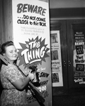 Margaret Drain, 26-years-old, born on Halloween night, was the winner of a contest to view a showing of "The Thing" at the Worth Theater. Published in the evening edition, May 30, 1951.