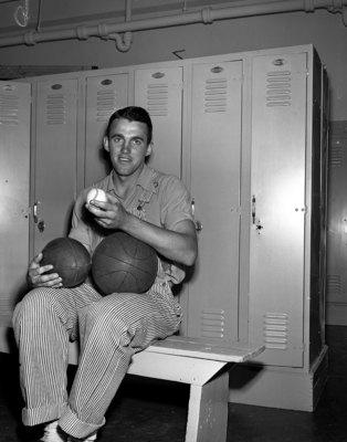 Amon Carter Riverside's Herman Richardson demonstrates his favorite sports with essential equipment: football, basketball, and baseball. Herman Richardson is shown seated on a bench in a locker room holding a basketball, football and a baseball. Published in Fort Worth Star-Telegram evening edition June 1, 1951.