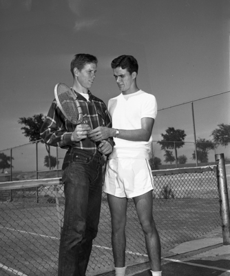 James (Excell) Amyett, left, Arlington Heights baseball player, learns how to hold tennis racquet from football and basketball teammate Gene Records. James Amyett is shown holding a tennis racquet while standing beside Gene Records (right). Published in Fort Worth Star-Telegram evening edition June 1, 1951.