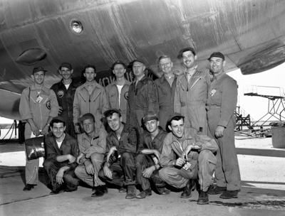 Crew members who were aboard B-36 No. 073 when it clocked its 1,000th hour in the air have a last picture made Monday with the tried and true aircraft before it is taken to the West Coast for installation of jet pods. Left to right standing are the 1st Lieutenant Harry R. Patrick of Georgetown, airplane commander; 1st Lieutenant Clyde F. Morehouse of San Antonio, pilot ; Lieutenant Colonel Arthur C. Madley of Temple, pilot; Captain Mood L. Gee of Sulphur Springs, navigator Captain John L. Winkel of St. Louis, bombardier; Captain Donald F. Perkins, of Lynn, Massachusetts, bombardier; Captain James D. Mahaffey of St. Louis, radar operator, and 1st Lieutenant Leland H. Neville of Park City, Ky, flight engineer, and left to right kneeling, Technical Sergeant Jack M. Brigham of Long Beach, Washington, radio operator; Master Sergeant James R. Shumate of Red Spring, gunner; Sergeant William T. Lynch of Black River Falls, Wisconsin, gunner; Staff Sergeant Edward J. Beila of Holyoke, Massachusetts, gunner, and Sergeant Richard M. Fowlie of Rockland, Maine, radar machine. Published in Fort Worth Star-Telegram morning edition May 29, 1951.