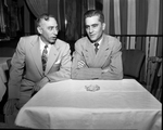Frank Mortlock, left, of Gulf Oil Corporation, and Kirby Warren of Sinclair Oil Corporation, right. The two man are sitting at a dining table having a conversation. Frank Mortlock looks at Kirby Warren whose arms are crossed and is not making eye contact with Mortlock.