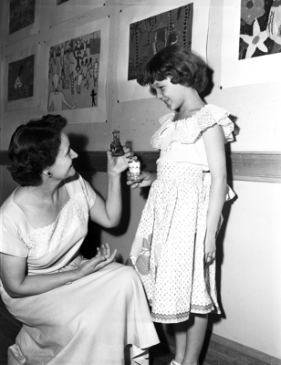 Mrs. George R. Schroeter, left, and her seven-year-old daughter Deanna Schroeter, both of 3500 Avenue K, are shown admiring a collection of sake cups and chessmen, which Colonel and Mrs. John L. M. Desislet lent to the Fort Worth Art Association for exhibition. Mrs. Schroeter holds a hand-carved painted ivory chess piece that was approximately 200 years old, while Deanna holds a cavalry cup. Published in the morning edition, June 3, 1951.