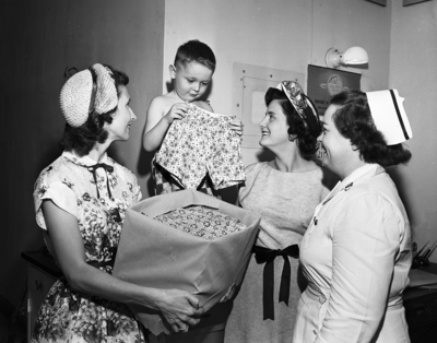 Fifty pairs of colorful boxer-shorts made by members of the S. S. Dillow Pre-School Association were presented to patients in City-County Hospital polio ward, by Mrs. T. H. Ratliff, left, retiring president, and Mrs. J. D. Bower, second from right, new president. Shown holding up a pair for Nurse Mary McCoy, right, to look at is young Glenn Morris Day III, a patient in the ward and son of Mr. and Mrs. Glenn Morris Day, of Mansfield. Published in the evening edition, May 30, 1951.