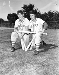 Leslie Mattison, left, and Tommy Runnels will be feared batsman when they play for North Side in state high school meet. Published in Fort Worth Star-Telegram morning edition, June 3, 1951. Two men wearing baseball uniforms holding baseball bats. They are smiling on one knee both of them.