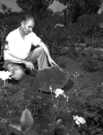 Rose testing is just one of the interesting facets of G. E. Hughes' gardening program on the two acres he owns at 2616 Handley Dr. Hughes is shown here in the rose garden where he watches the reaction of plants, sent by growers from over the nation, to Texas weather. He is a rosarian for the Fort Worth Men's Garden club. Published in Fort Worth Star-Telegram morning edition June 3, 1951.