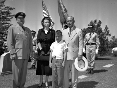 Special guests at the Memorial day ceremony, in which Carswell Air Base paid tribute to the man for whom it is named, Major Horace S. Carswell Jr., at his grave in Rose Hill, were, left to right, Mrs. Virginia Myers of San Angelo, his widow; their son, Robert, and H. S. Carswell of 1614 Denver Ave., his father. There is one unidentified man to the right of H. S. Carswell and another man to the left of Mrs. Virginia Myers. Published in Fort Worth Star-Telegram evening edition May 30, 1951.