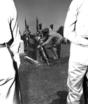 Framed by the ranks of a rifle squad and against a backdrop made up of a color guard, Major General Clarence S. Irvine, commander of the 19th Air Division, Carswell Air Base, places a Memorial day wreath on the Rose Hill grave of the man for whom the base is named, Major Horace S. Carswell, Jr. Published in Fort Worth Star-Telegram morning edition May 31, 1951.