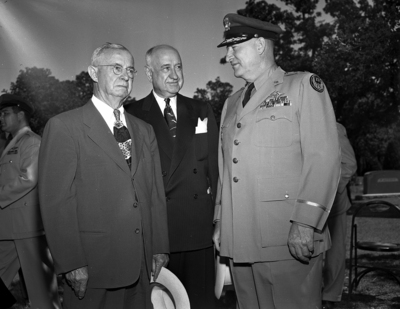 Left to right, Mayor J. R. Edwards, Amon G. Carter, and Major General Clarence S. Irvine were speakers Wednesday morning at a ceremony in Rose Hill during which Carswell Air Base honored the late Major Horace S. Carswell, Jr. Published in Fort Worth Star-Telegram evening edition May 30, 1951.