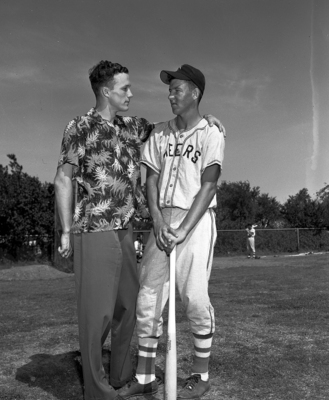David Finney, left, North Side trackman in spring, wishes fellow grind man and cager Kermit Allen good luck in upcoming state high school baseball meet. Kermit Allen is standing to the right dressed in his baseball uniform, holding a baseball bat and David Finney is standing to the left. Published in Fort Worth Star-Telegram evening edition June 1, 1951.