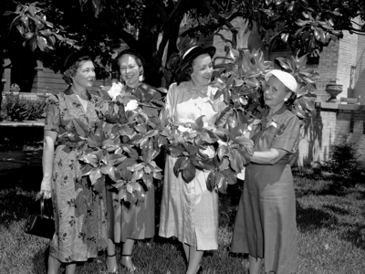The new officers of the Woman's Club at the annual "Magnolia Luncheon" are pictured with one of the Club's prized trees. Left to right, Mmes. J. Franklin Campbell, first vice president; Simon Freese, executive committee member; Carey Hiett, third vice president; and A. M. Campbell, executive committee member. The new officers will be installed at the luncheon. Four women can be seen holding branches and flowers from their prized trees. Published in Fort Worth Star-Telegram evening edition June 4, 1951.