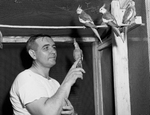 Ray Armstrong is shown with birds in a cage with birds. He is holding one on his finger.. Published in Fort Worth Star-Telegram morning edition June 9, 1951.