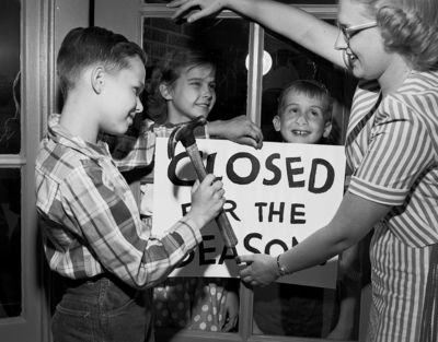 Mike Williams, Crestwood Elementary School, aided by his teacher, Miss Ellen Hausman, puts a "closed for the season" placard on the door. Inside, eager to go, are Gary Causer and Marilyn Russey. Miss Ellen and her students can be seen holding a board with happy faces. Published in Fort Worth Star-Telegram evening edition June 1, 1951.
