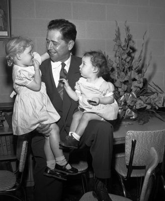 Reverend George Crittenden, founder of Maddox Avenue Children's Home, holds two of its children, Royalene Nealy, 3, right, and Elaine Stanley, 1, during dedication services of the new building at 3900 S. Riverside Dr. Rev. George Crittenden can be seen holding two children on his lap. Published in Fort Worth Star-Telegram morning edition June 1, 1951.
