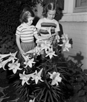 Peggy and Marsha Stovall, daughters of Mr. and Mrs. R. M. Stovall, 2428 Medford Ct. E, admire some of the 41 blooms on a lily plant in the yard at the home of Mrs. D. B. Whitson, 3025 Waits. The plant was an Easter gift. . Published in Fort Worth Star-Telegram morning edition June 10, 1951.