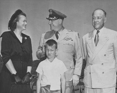 From left, Mrs. Virginia Ede Myers and son Robert, Maj. Gen. Clarence S. Irvine, and H. S. Carswell. The day's honors and memorial tribute to Carswell Base namesake. Honored guests were Mrs. Myers of San Angelo, Carswell's widow, Robert, his son, and father H. S. Carswell. 05/31/1951
