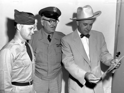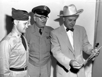 The Air Material Command's newly assigned representative at Bell Aircraft Corporation's Plant number 1, Captain Kenneth D. Albert, left, and his "boss", Major Charles V. Williams of Niagara Falls, N. Y. were shown a detail of the helicopter assembly going on by William H. Gunderson, plant manager. William H. Gunderson at the right is seen holding a paper next to Captain Albert and Major Williams. Published in Fort Worth Star-Telegram evening edition June 1, 1951.