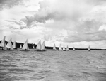 Image shows Snipe boats contesting in the 15th annual Inter-Club Regatta at Eagle Mountain Lake. Snipe Number 4479, sixth from left, controlled by Leonard Adelman, San Antonio, won by five yards. In second place was Snipe number 7391, second from right, controlled by Hunter Barrett, Fort Worth Boat Club. 10 unidentified Snipe boats. Published in the Fort Worth Star-Telegram morning edition, June 3, 1951.