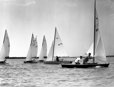 Image shows six Snipe boats at Eagle Mountain Lake. Snipe boat on far right shows Ted Rawlins, Olney handling the sail, and Skipper Hollis Metcalf brings his snipe boat round a buoy. Published in the Fort Worth Star-Telegram morning edition, June 4, 1951.